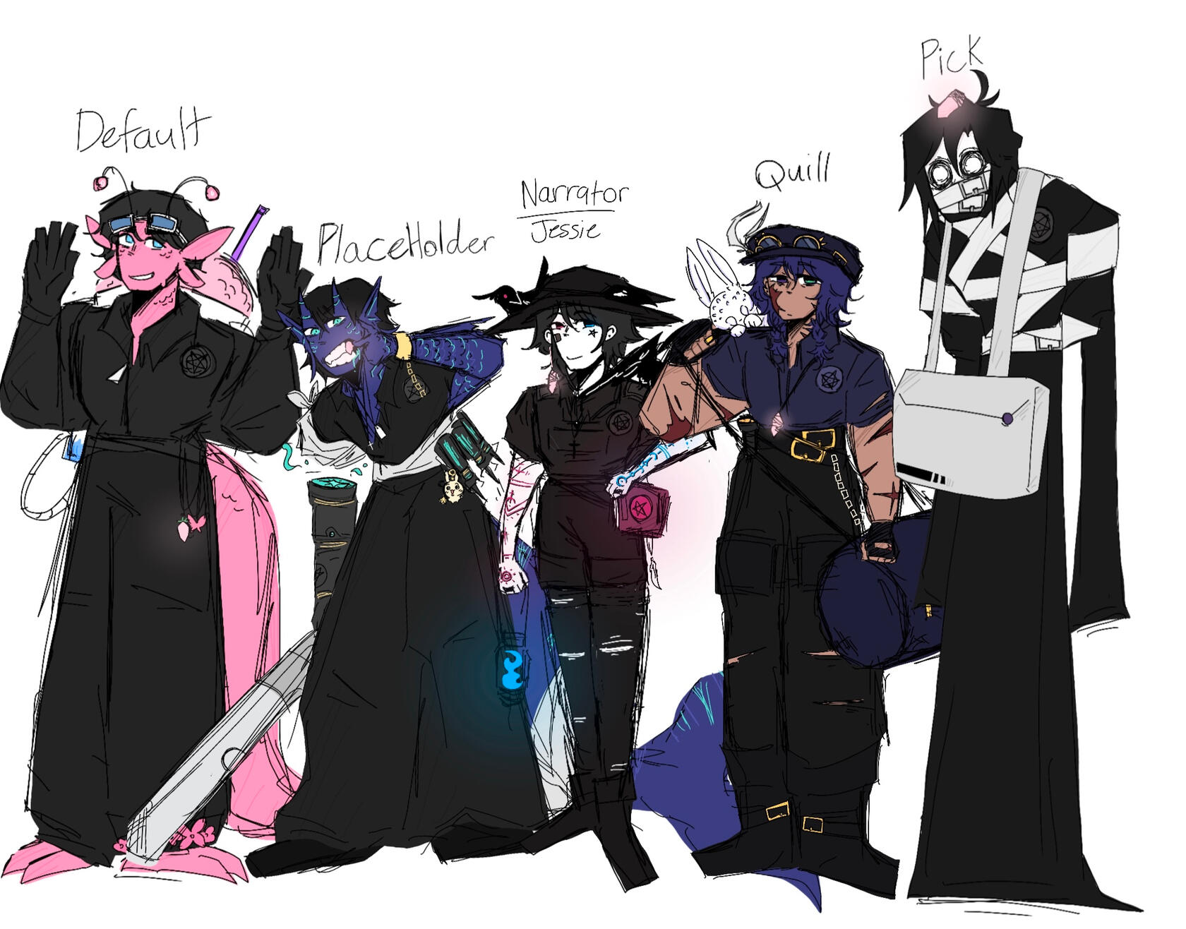 Sketched and coloured Default, Placeholder, Jessie, Quill, and Pick..